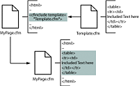 Including pages with the cfinclude tagThe cfinclude tag adds the contents of a ColdFusion page to another ColdFusion page, as if the code on the included page was part of the page that uses the cfinclude tag. It lets you pursue a “write once use multiple times” strategy for ColdFusion elements that you incorporate in multiple pages. Instead of copying and maintaining the same code on multiple pages, you can store the code in one page and then reference it in many pages. For example, the cfinclude tag is commonly used to place a header and footer on multiple pages. This way, if you change the header or footer design, you only change the contents of a single file. The model of an included page is that it is part of your page; it just resides in a separate file. The cfinclude tag cannot pass parameters to the included page, but the included page has access to all the variables on the page that includes it. The following image shows this model: Using the cfinclude tagWhen you use the cfinclude tag to include one ColdFusion page in another ColdFusion page, the page that includes another page is referred to as the calling page. When ColdFusion encounters a cfinclude tag it replaces the tag on the calling page with the output from processing the included page. The included page can also set variables in the calling page. The following line shows a sample cfinclude tag: <cfinclude template = "header.cfm"> Note: You cannot break CFML code blocks across pages.