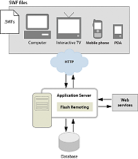 About using the Flash Remoting service with ColdFusionContents [Hide]Using the Flash Remoting service of ColdFusion, ColdFusion developers can work with Flash MX 2004 designers to build Flash user interfaces (UIs) for ColdFusion applications. Building Flash UIs requires the separation of user interface code from business logic code. You build user interface controls in Flash, and you build the business logic in ColdFusion. The following is a simplified representation of the relationship between Flash and ColdFusion: Planning your SWF applicationWhen you are planning ColdFusion application development with Flash UIs, remember the importance of separating display code from business logic. Separating display code from business logic enables your ColdFusion applications to interact with multiple client types, such as SWF applications, web browsers, and web services. When you build ColdFusion applications for multiple clients, your ColdFusion pages and components return common data types, including strings, integers, query objects, structures, and arrays. Clients that receive the results can process the passed data according to the client type, such as ActionScript with Flash, or CFML with ColdFusion. To use the Flash Remoting service with ColdFusion, you build ColdFusion pages and components or deploy Java objects. In ColdFusion pages, you use the Flash variable scope to interact with SWF applications. ColdFusion components (CFCs) natively support Flash interaction. The public methods of Java objects are also available to the Flash Remoting service. The Flash Remoting ActionScript API has been updated to comply with ActionScript 2.0. The ActionScript 2.0 version of the API consists of the following significant features: